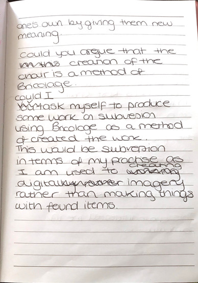 I have thought that maybe I could use this struggle to help me create work. Like the story I completed earlier, I could design work that shows how I feel about this project rather than the project itself. I need to find a method of working that can be considered subversive. This would allow me to obtain whether there is an enhancement in my creativity.