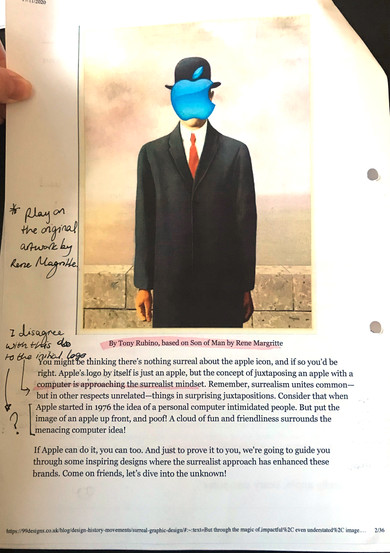 I have included the annotated pages below. There were a lot of image examples in some of the articles. I didn't agree with everything said in one article in particular and I did decide that maybe looking at surrealists graphic designers wasn't the best idea as the other subversive designers I have looked at are much more out there. However, I do think using some of the surrealist ways of thinking could be useful to me in this project.